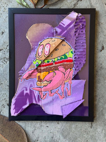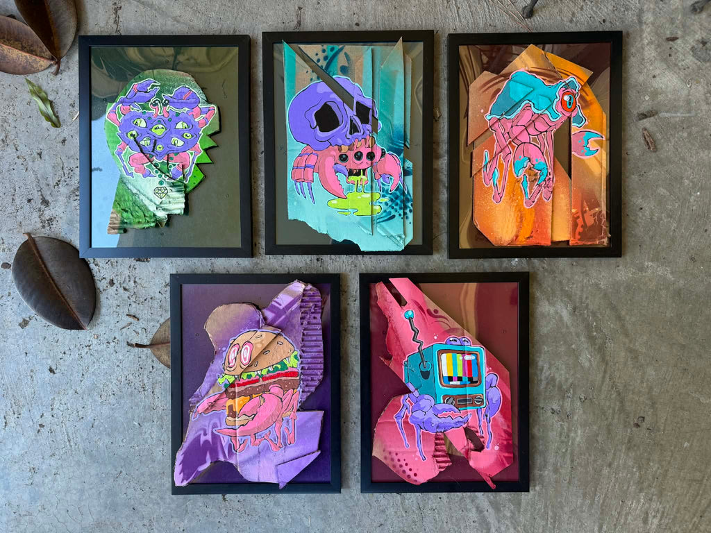 Mixed media series created by using cardboard, acrylic paint and spraypaint, affixed to a hangable frame.  All measure around 9x12''