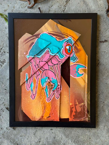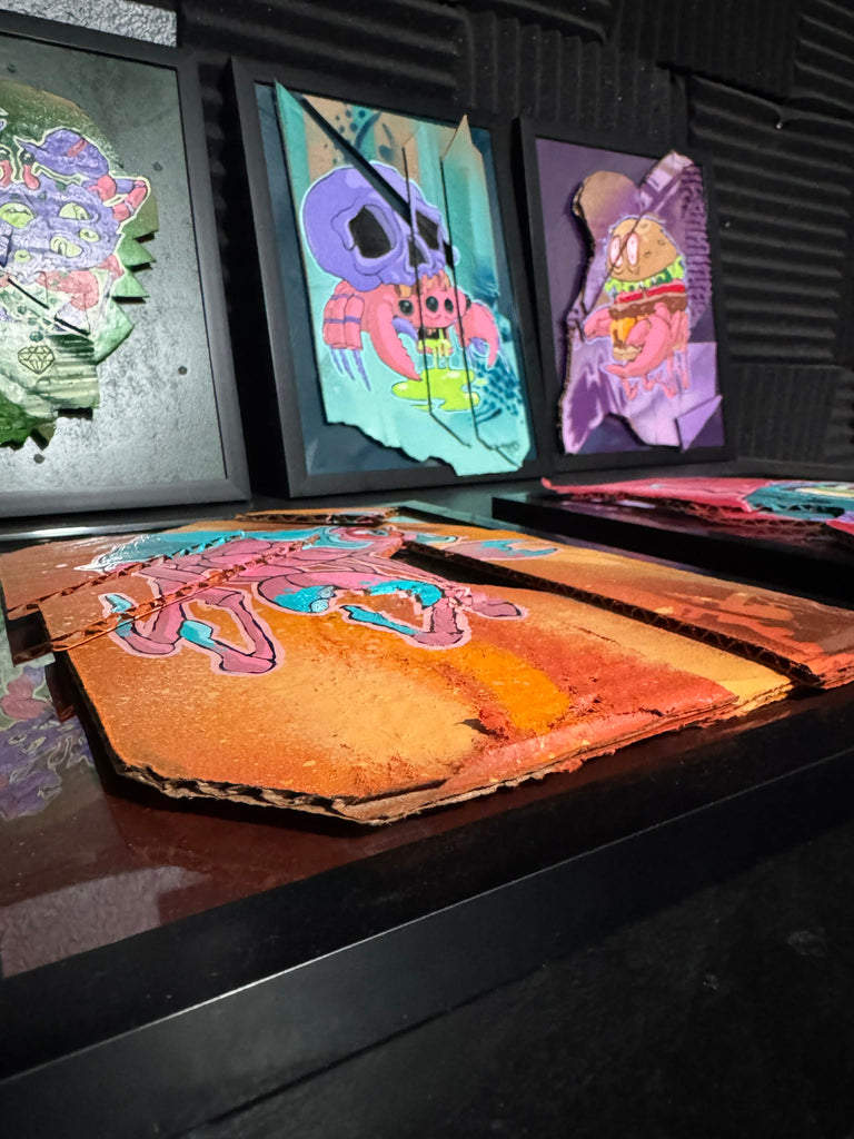 Mixed media series created by using cardboard, acrylic paint and spraypaint, affixed to a hangable frame. All measure around 9x12''